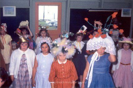 Color photo showing another group of girls standing in two rows wearing their decorative hats, the largest of which is worn by a girl in blue whose hat is white lace with long-stemmed red flowers growing out the top.Collection