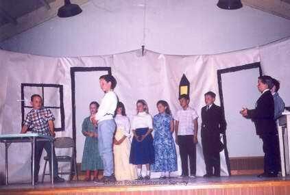 This color photograph is of a stage consisting of a platform with a backdrop of white material with a window and two doors painted on it. Between the doors a lamp is painted. At the left there is a table and chair (under the window). A boy in a check shirt is standing behind the table. To the right and facing the table is a boy in a white sweater and jeans. Lined up against the backdrop are four girls and two boys. From left to right the girls are wearing an ankle length aqua dress, a long yello dress, a mid calf lenth blue skirt and white blouse and an ankle length blue and white print dress. To the right of the girls the two boys are wearing dark pants and a light shirt and a dark suit, respectively. At the far right are two boys, one in a blue suit and one in a grey one. All the children have their attention focused on the boy in the check shirt. Two ceiling lights can be seen at the top of the picture, illuminating the stage.Collection