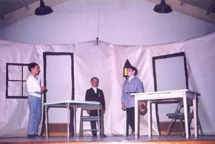 This color photograph is of the same stage as the previous one but there are two tables and two chairs on the stage. The boy in the jeans and white sweater is standing on the left facing center. A boy in a dark suit is standing against the backdrop at center stage and on the right, facing the boy on the left is a girl in dark pants and a grey tunic. Her hair is pulled back in a bun and she is holding something about the size of a bowling ball in her left hand.Collection