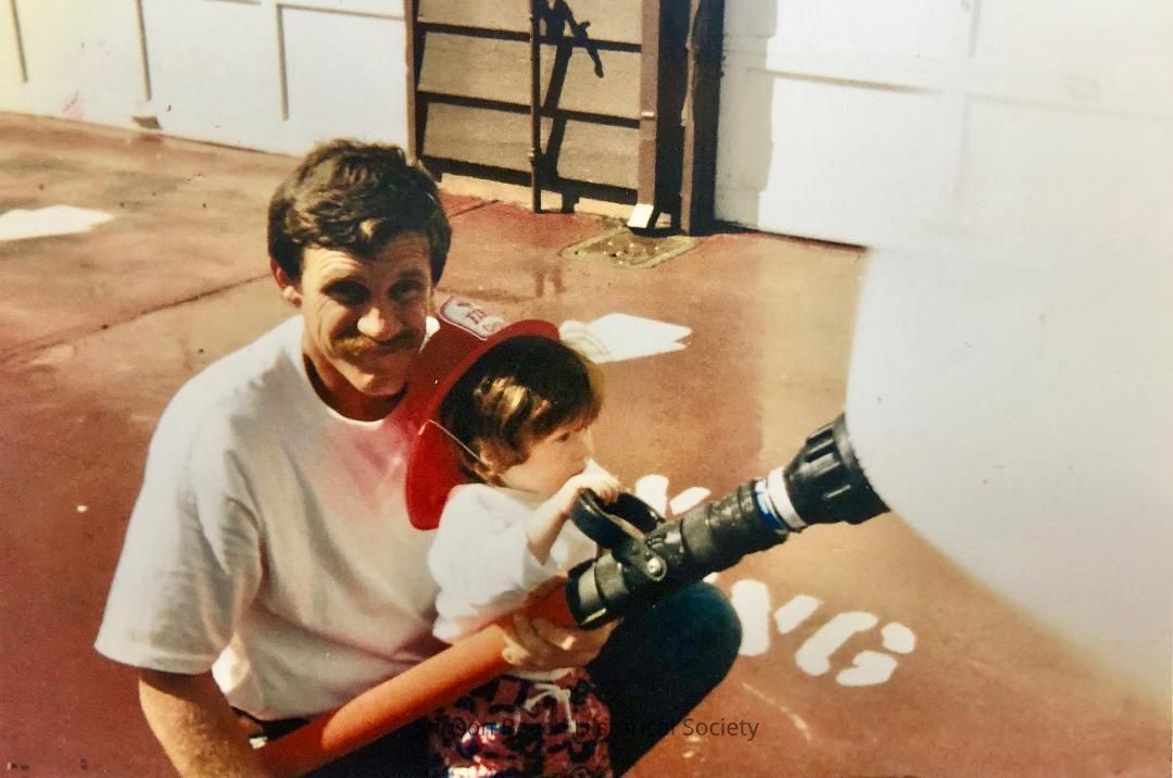 Kenny Stevens, firefighter, and Jesse Peri, almost two years old. Kenny became fire chief in 2001. Jesse Peri became fire chief in 2021. Who knew?