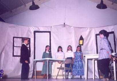 This color photo is of the same stage as in the previous pictures. The two tables are visible. The boy in the dark suit is standing at the left and facing center. The girl in the tunic is standing at the right and facing center and towards the back where the four girls described in #1996-208 are standing against the backdrop in the same position as before.Collection