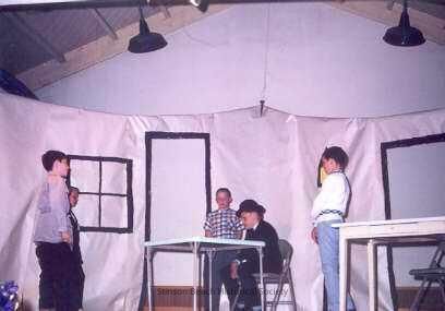 This color photo is of the same stage as previously described in #1996-208. The girl in the tunic is standing at the left facing center. Behind her, mostly obscured by her is a boy in a dark suit. Seated at a table at center stage is a boy in a dark suit, wearing a hat. Behind him, against the backdrop is the boy in a checked shirt and to the right, facing them, is the boy in the jeans and white sweater.Collection
