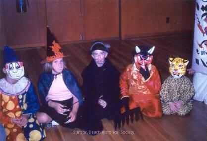 This color photograph is of five children sitting on the floor in a row, in costume. They are, from left to right, a clown, a witch, a pirate, a devil and a leopard.Collection