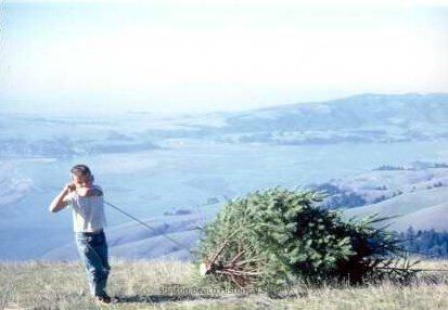 This color photograph is of a boy pulling on a rope which is attached to a cut Chrismas tree. He is dragging it toward the camera. He is on top of a hill with a vista of hills and a lagoon behind him. The boy is Greg Sherfey and the Bolinas Lagoon is behind him.Collection