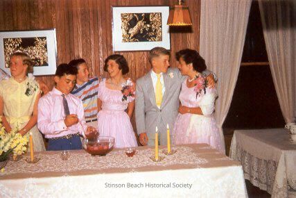 Group of young graduates (L. to R. Diane Smith; Tom Curr, Dick & Jean Bell; Richard Reasoner; Deanna McKinnon gathered at a cloth-draped table. Tom pours punch into a cup from a punch bowl, Dick and Jean smile at each other; Richard has his arm around Deanna who looks at him intently. Deanna wears yellow, the other girls are in pink. They each sport fancy corsages. Richard is in a gray suit and yellow tie. Tom in pale pink shirt and tie. Dick wears a striped t-shirt.Collection