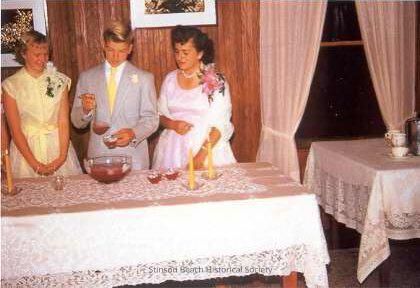 This color photograph is of three young people standing behind a table covered by a lace table cloth with a glass punch bowl and candles on it. On the left side is a girl (Diane Smith) in a pale yellow dress and a corsage of white flowers. On the right is a girl (Deanna McKennon) in a white dress with a pink corsage. Between the girls is a boy (Richard Reasoner) in a pale grey suit and yellow tie ladling punch into a punch cup. Both girls are watching the process as is the boy. There is a wood panel wall behind them with two pictures hanging and a window with curtains to the right with part of another table visible also with a lace cloth.Collection