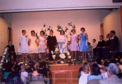 This color photograph is of a stage on which are standing, in a row, seven young people. They are three girls in party dresses on each end with a boy in a black suit in the middle. There is a row of boys in suits seated against the side wall on the right and a single boy seated against the wall on the left. There is a spray of yellow flowers at center stage in front of the standing students. The backs of the audience are visible on either side of a center aisle in the foreground.Collection