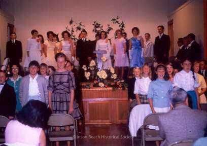This color photograph is similar to #1996-226-01 in all respects except there are children standing behind the the seven described and the front 3 rows of the audience (younger children than the graduates on stage) are standing and facing the camera.Collection