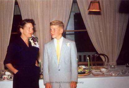 This color photograph is of a woman in a dark blue dress and corsage and a boy in a light grey suit and yellow tie. They are looking toward each other. They are Mrs. Jessie Reasoner and her son Richard. Behind them is a table with candles, teacups, punch glasses and plates of food and behind the table is a window with 3 swagged curtains.Collection