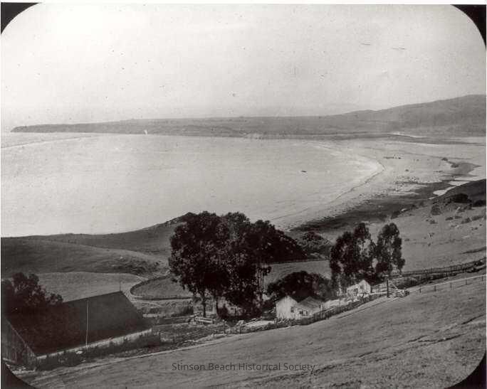 B&W photo taken from a higher elevation onto White Gate Ranch overlooking a barren Stinson Beach and Bolinas Bay. Nestled between a copse of trees are a white farmhouse and outbuildings surrounded by wooden fencing. To the left is a large barn or stable.Collection