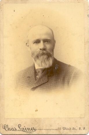 Sepia tone portrait of Amos Stinson by Chas. Lainer of (31 Third St.) San Francisco, CA circa 1911. He is a bald man with deep set eyes, long full nose, and bushy but well-trimmed moustache and beard. He is wearing a checkered jacket over an unusual dark neckpiece. The back of the portrait reads LAINER, INSTANTANEOUS Photos, 715 Market St., San Francisco, Cal. It also has numerous circle graphics which say either Mechanics Institute, San Francisco or Industrial Exhibition 1885 - Awarded to CHs Lainer (for Best Photographs, finished in oil & watercolors; Photographs, crayon finish; retouched photographs). In pencil is written Father ... Amos Stinson.Collection