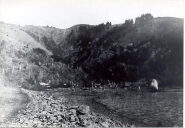 Turn of the century photo of Bolinas Lagoon, identified on the back as Bay Road, 1899. Also identified but difficult to see is Capt. P. Bourne's Powerboat, "Fearless." Mostly what is visible is rocky side of Bolinas Lagoon waterway and tree-covered hillside rising up behind some waterfront cottages. Lagoon road is in the background separated by wooden poles.Collection