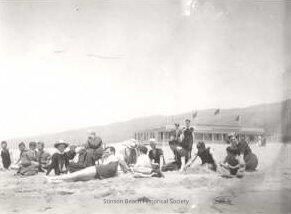 B&W photo of a group of men, women and children lounging, sitting, standing and playing on the beach in turn-of-the-century garb. In the background is the Dipsea Inn, a one-story flat-roofed building with flags atop it blowing in the wind.Collection