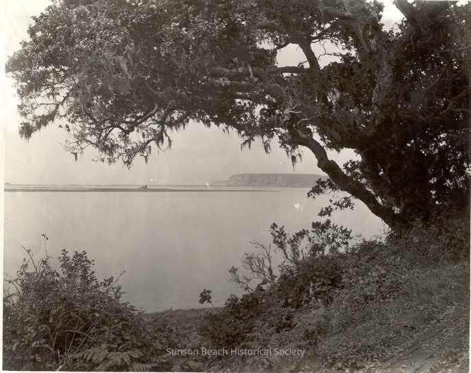 This black and white photograph shows a body of water beyond which is a low spit of land on the left and a point of land on the right. The low spit is the Stinson Beach sandspit and the point of land is the Bolinas Mesa. The water is the Bolinas Lagoon. The foreground is a shrubby bank with a tree on the right, leaning out to the left obscuring the sky. The lagoon is thus framed by the bank and the tree.Collection