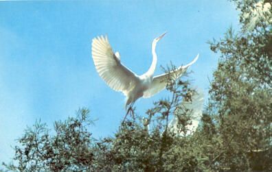 This color Audubon Canyon Ranch postcard centers on one white egret who is taking flight from a treetop. His neck is outstretched and his wings are spread wide. There are two other egrets visible to the right but they are partially obscured by branches.Collection