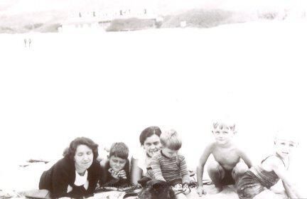 This black and white photograph is of two women and four children on the beach. The women are lying on their stomachs facing the camera and the children are lying or sitting beside them. They are from left to right Mrs. McNamara, Ralph, Betty McNamara Emery and the two children on the right who are unidentified. The structure behind them is Van Osten's Casino which became Sea Downs.Collection
