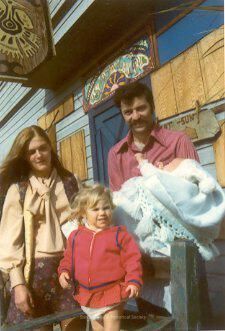 The Niederberger family in 1969 stand in front of the Sunshine Gallery in Stinson Beach. A moderately psychedelic sign over the wooden doorway displays the name of the gallery. A second sign with a painted bird hangs from the building.The family (L. to R.) is Sunshine (Janet) in a beige long-sleeve blouse wiwth a same color scarf tied around her neck, floral mini skirt and vest; her long brown hair blows gently away from her face in the breeze; young, blond Kiren, dressed in red zip-up jacket and skirt under which a diaper is showing, stands in front her parents, probably on a bench; Pete, wearing a mauve shirt and moustache, is holding baby Josh in a blue blanket.Collection