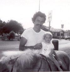 Pete holds his very young daughter, Kiren, on the back of a Shetland pony (only a portion of which is visible). The location is Highway 1 and in the background is the old Chevron service station.Collection