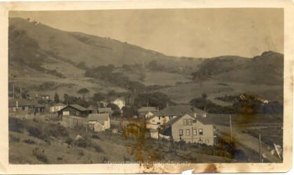 Black and white photograph of Stinson Beach scene with houses in early1920s. Photo is taken from location near the present day library looking toward hills where the White Gate Ranch was on present Panoramic Highway. Starting from the unpaved present Highway1 at the lower right, old Fitzhenry house, Airey Store, present antique store, Seabeach Hotel along the highway is seen. Above the store on the hills, 9 more early houses in Stinson can be seen. Hills toward the Panoramic Highway is void of any developments, there are some houses, more like present Chevalier home, near the junction of Highway 1 and Panoramic can be also seen.Collection
