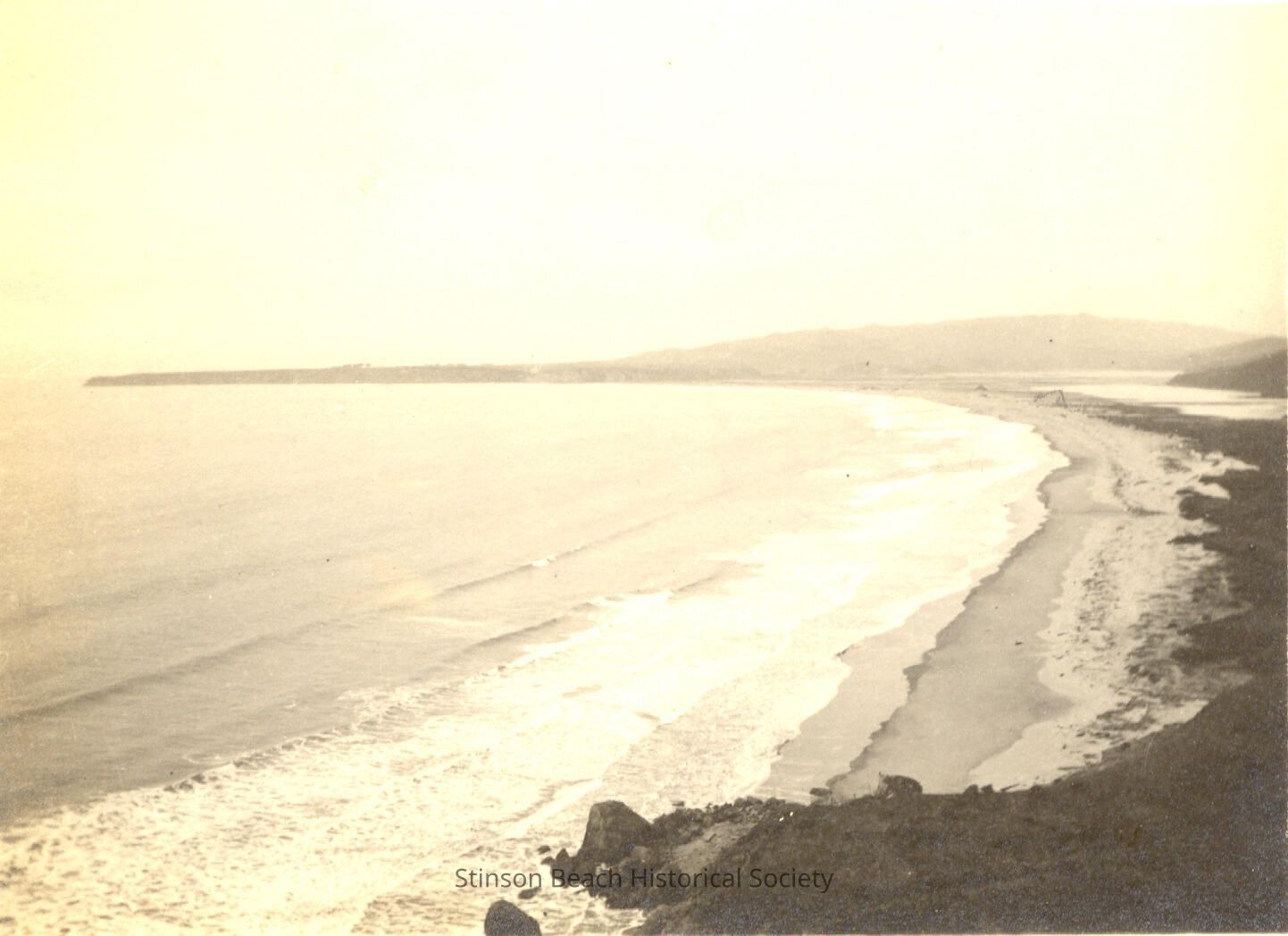 Black and White photo postcard showing panoramic view of Stinson Beach taken from near Rocky Point. It shows Bolinas Peninsula in distance, the lagoon, surf, the rocks at the South End. No detectable development is seen along the beach except a group of tents in the mist.Collection