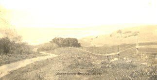 A black and white photo postcard of 1900s looking down toward Stinson Beach and Bolinas from near White Gate Ranch, near Stage Road to Mill Valley through Mt. Tamalpais. The fence to the right separated Rancho Bolinas and Ranch Sausalito Spanish land grants. Capt. Easkoot's's barn is the only visible development.Collection
