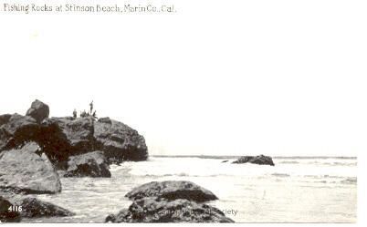 A black and white photo postcard. The photo shows 6 people standing on top of the rocks at the southern end of Stinson Beach. A group of rocks are shown against the surf. The caption reads: Fishing Rock at Stinson Beach, Marin Co., Cal. The post card is printed by Pacific Novelty Co. of San Francisco.Collection