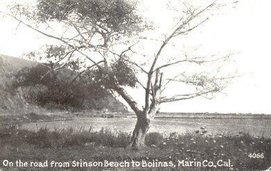 A black and white photo postcard. The photo shows view around lagoon road. It is near the old McKinnon's Landing. A lone tree stands in the middle of the picture.The caption reads: "On the road from Stinson Beach to Bolinas, Marin Co., Cal." The postcard is printed by Pacific Novelty Co. of San FranciscoCollection