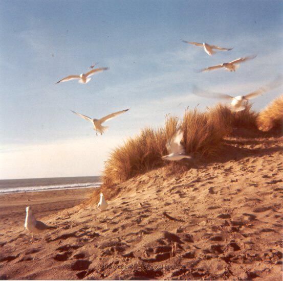 Color photo of a flock of seagulls landing in the "dunes just south of old Seadowns, circa 1950." Six seagulls are in flight over the dune/dune grass; two are on the sand. Sky is blue with a hint of a fog bank offshore. Surf is gentle.Collection