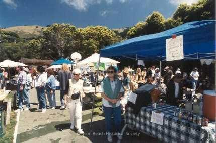 This color photograph is of a gathering of people walking among display tables shaded by canopies and umbrellas. At the right of the picture is a table covered by a blue and white tablecloth with a blue canopy and displaying soft drinks. There are two people near it in the foreground. There are many people and umbrellas in the background behind which are trees.Collection