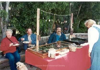 This color photograph depicts three people sitting on a bench behind a table. The lady on the left is wearing a red shirt and blue pants. She is holding a paper plate of food and a dog is siting at her feet looking at the camera, as is the lady. Next to her is a man in a blue jacket also holding a plate and eating. Next to him is another man wearing a blue shrt and a darker blue jacket. He is looking at the camera and smiling. In front of the two men is a table covered with a red cloth. There are jewelry display cases on the table. At the far right of the picture there is a woman in a blue jumper and white blouse. She has her back to the camera and is looking at the display.Collection