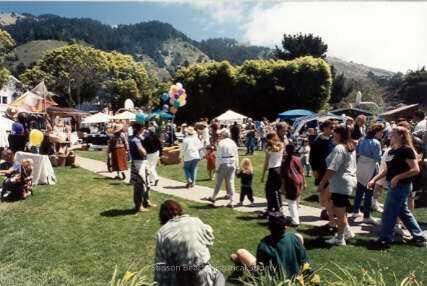 This color photograph shows a cement pathway dividing a lawn area. A crowd of people are walking or standing on the path and grass. Two people are sitting on the lawn in the foreground with their backs to the camera. There are tables and umbrellas in the background with a bunch of colored balloons at the center of the picture. Behind the umbrellas are trees with mountains visible beyond.Collection