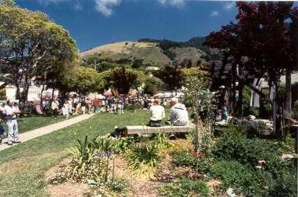 This color photo shows a bed of agapanthus and some groundcover with a small tree at the center in the foreground. Beyond the bed is a bench with two people sitting on it with their backs to the camera. At the left of the picture is a cement path crossing a lawn. There are people gathered at the far end of the path where some tables and umbrellas are visible. There are trees bordering the area photographed and mountains rising behind the scene.Collection