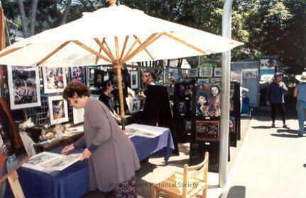 A woman in lavender bends over a table displaying art prints. There is a white umbrella shading the table. There are framed art prints on the fence behind the table and two other women talking in the background.Collection