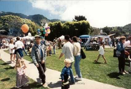 There is a cement walk in the foreground of this color photograph. Beyond it is a green lawn with tables shaded by awnings and umbrellas in the background. There are people walking on the cement path as well as the lawn. There is a bunch of colored balloons in the background and an orange balloon in the foreground held by a little girl standing beside the path. Trees and mountains are visible behind the people and booths.Collection