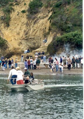 This color photograph shows a boat traveling across water toward the camera. There are 5 people on the boat and all but one are looking backwards toward the shore where people are gathered. Cliffs rise up behind the people on the beach and some people have climbed and are perched partway up the foot of the cliff. There is smoke visible at the right side of the picture behind the people standing on the shore.Collection
