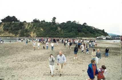 This color photograph shows a tree covered bluff in the background (Bolinas Little Mesa). There is a crowd of people beneath the bluff at the center of the photo with water visible on each side. The water on the left side is Bolinas Bay at the entrance to Bolinas Channel. There are people lining the far (Bolinas) shore just under the bluff. The water on the right is Bolinas Lagoon. There are houses lining the lagoon on the Bolinas side. The people at the center are standing on the sandspit which forms the Stinson Beach bank of the Bolinas Channel. The camera is looking down the length of the sandspit towards Bolinas. There are people drifting away from the crowd at the end, walking toward the camera.Collection