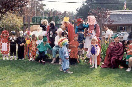 A group of young costumed children (and a few adults) from the Montessori Pre-School assembled in Village Green I on the grass in front of the playground, the top of the climbing structure can be seen over their heads as well as the front of the Parkside Cafe. Mildred Sadler is slightly visible seated in the center.Collection