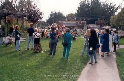Long view of the Village Green where parents are scattered in a semicircle watching (and taking pictures of) the group of costumed children assembled at the end of the Green by the playground. Parkside is visible in the background.Collection