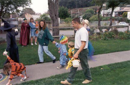 Walking on the path through VGI are parents Mary Greenway and Chris Kelly, each holding the hand of their child. Actually, everyone is holding hands as they walk together. There are other costumed people in the photo - a witch, all in black holding the hand of a child in a tiger suit who is picking something off the ground, is waving to a couple standing by the fence, one is in a costume of purple while the woman in denim holds an infant in her arms.Collection