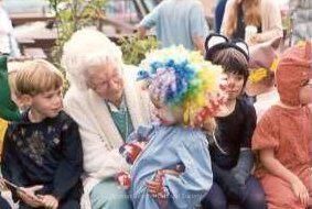 Mildred Sadler sits on a bench in VGI surrounded by children (only 4 are actually visible) in costume. She is bending forward and talking to a child in blue with multicolored hair standing in front of her. Two boys in black sit on either side of Mildred.Collection