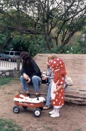 This color photograph is of a woman sitting on a bench looking over her shoulder, away from the camera, and 2 children standing beside her. One of the children is obscured by the other. The child who is visible is wearing a red dress with white polkadots with a matching hat and a white apron and white shoes and socks. She has a Raggedy Anne red yarn wig and is holding the handle of a red wagon with a Raggedy Anne doll lying in white bedding.Collection