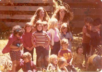 Stinson Beach Preschool (1974?) class with teacher Leah Ward (on the right, wearing glasses) gathered outside in the yard adjacent to Community Center. Some children: Rebecca Zell front center; Vasco Agnoli in football shirt with number 8; Michael McCarthy standing in striped shirt...Collection