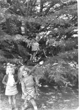 This black and white photo shows five children in and around a tree. The tree is bushy and the three children in it are partially obscured by the foliage.. Two girls are standing in front of the tree in the lower left hand corner.Collection