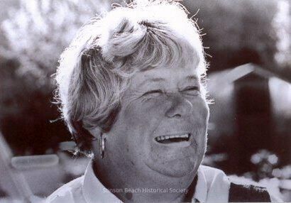 A black and white photograph of smiling face of Roberta (Bobbie) Shockey. Her hair is cropped short with the bangs. She was one of the 4 founders of the Stinson Beach Wildflower Show, 1958 to 1973. She was also known for her cooking and had catering service.Collection