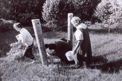 A black and white photograph taken in 1971 in which our 3 famous flower ladies (Menzies, Barbara/ Leary, Anne/ Shockey, Roberta) are going under the barbed wire fence on the way to collecting the wild flowers. Barbara carries a box with containers, Anne and Roberta have buckets in their hands. Barbara and Anne, who is just under the wire fence, are wearing pants and Roberta is wearing a floppy jumper skirt with a light-colored half-sleeve shirt. Trees, most likely the California Bay, can be seen on the other side of the fence.Collection