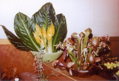 A color photograph of Wild Flower Show display at the community center. Two bouquets of odd looking flowers are arranged in various shaped vases. The show theme that year was Oddites of the Wildflower Kingdom. The large yellow flowers with large leaves look like short yellow calla lilies, the brownish flowers in front look like a fly-catcher type orchid.Collection