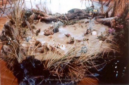A color photograph of Wildflower Show display of Beach Scene diorama at the community center in 1960. The large sand box is filled with flowers and grasses from beach.Collection
