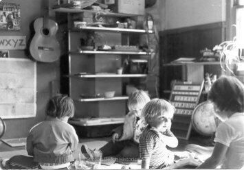 This black and white photo shows four children seated together on the floor working on a project. The wall behind the children has shelves against it and to the left a map, a picture, an alphabet chart and a guitar are hanging on the wall.Collection