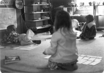 This black and white photograph shows three children sitting on the floor in separate areas working on separate projects. At the center of the picture there is a girl with her back to the camera kneeling in front of some cards lined up on the floor. Beyond the girl and to the left is a boy in a check shirt. He is over close to the wall with a map hanging on it. To the right of the girl is another boy sitting on the floor near a window.Collection