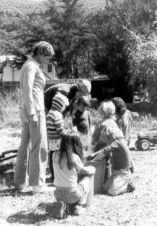 This black and white photo is of several children and 2 teachers gathered around a plastic bucket. They are outdoors on level ground and there are trees in the background.Collection